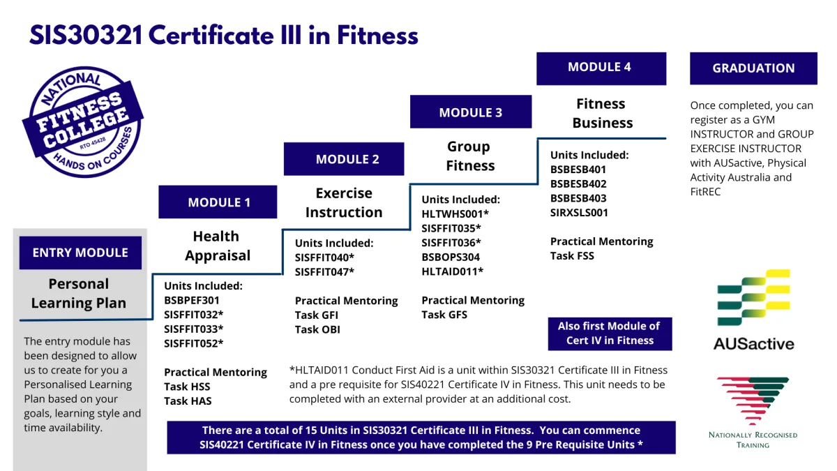 Certificate III in Fitness (SIS30321) is the entry level qualification needed to begin working in the Fitness Industry. This allows you to work as a Fitness Instructor, think taking Group Fitness classes, writing and showing clients exercise programs and helping out on the gym floor.