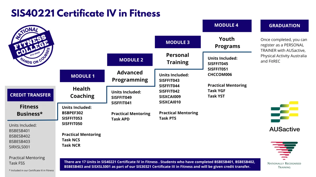 Certificate IV in Fitness (SIS40221) qualifies you as a Personal Trainer, this allows you to deliver one-on-one Personal Training sessions, personalise fitness programs, advanced coaching as well as learning about specific populations (such as training older adults or youth).