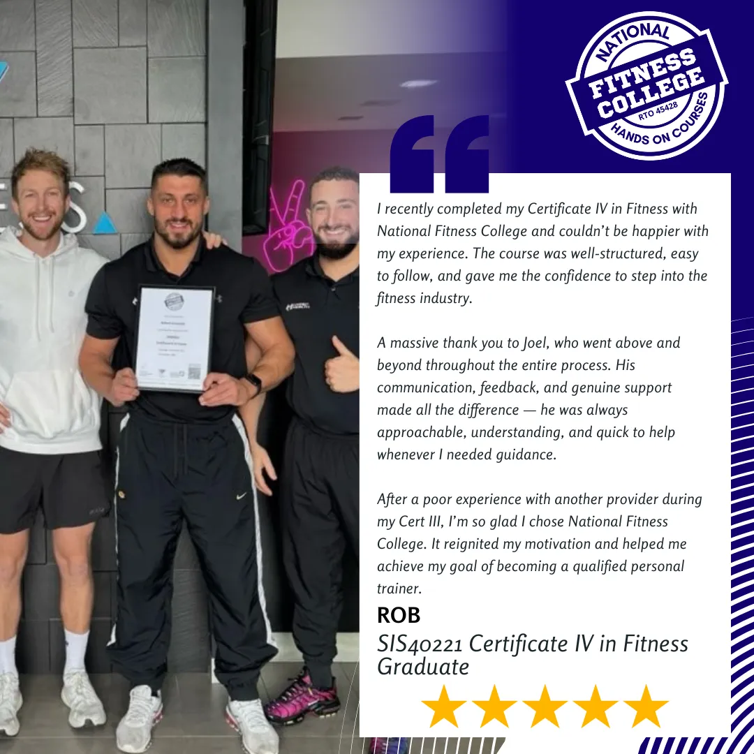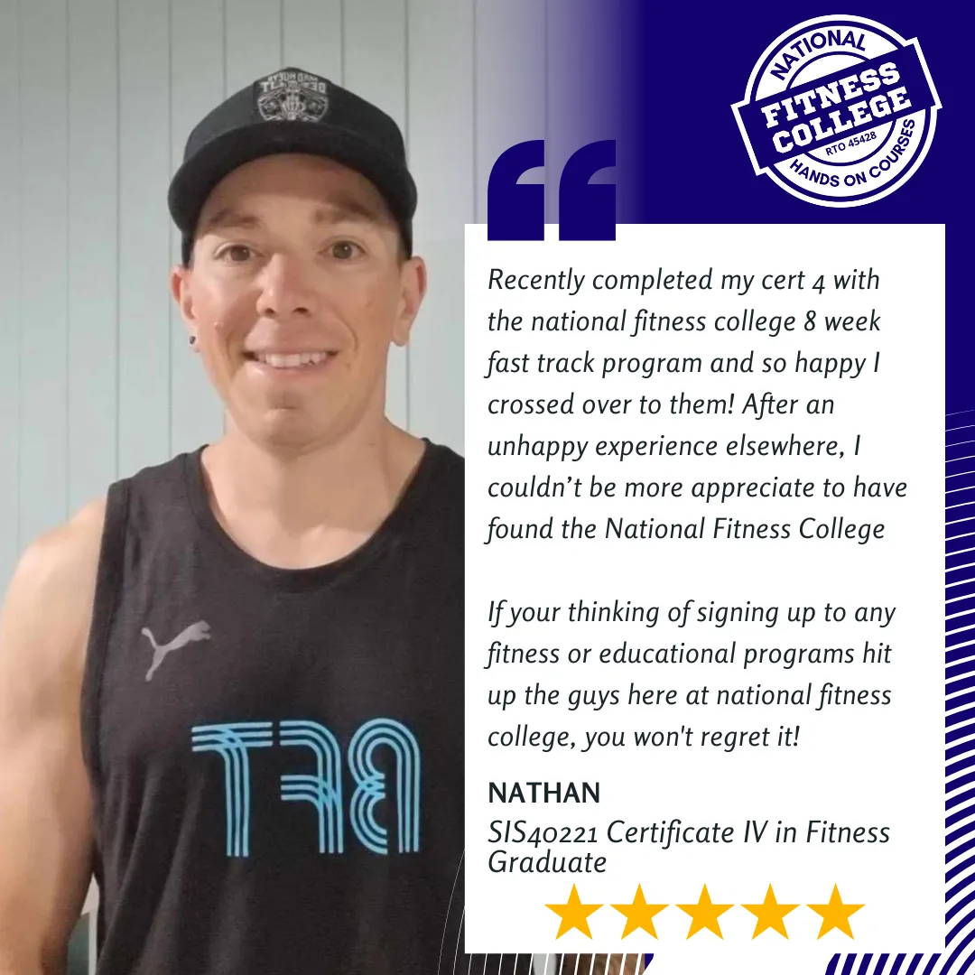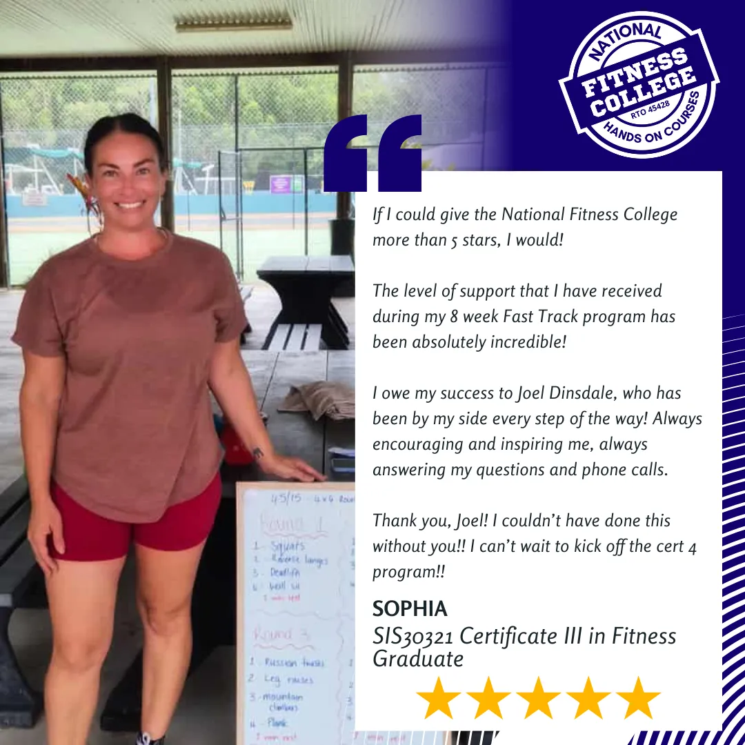Working full time and wondering how he could complete his studies, he started with a conversation with our Careers Manager to identify the best pathway for him. Having that burning desire to work in his gym, he decided that Fast Track was his best bet, and what a decision that turned out to be! Never missing a zoom session and engrossing himself within the content, Caleb completed back to back Fast Track Programs and attended our Practical Assessment Weekends to help him complete his studies whilst still working full time.